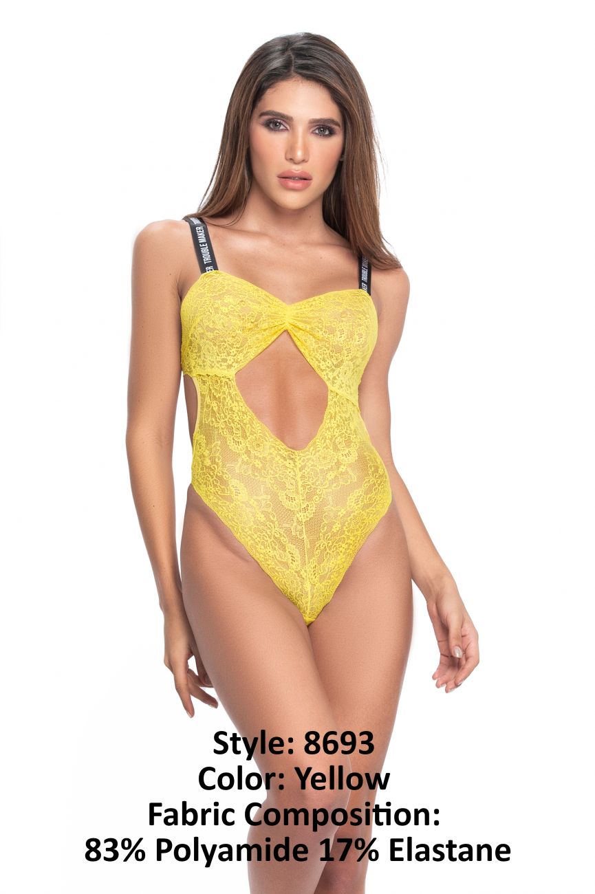 Give an injection of color to your outfit with this printed lace and elastic bodysuit. Front cutout and ruched detail, thong coverage, adjustable crotch closure.